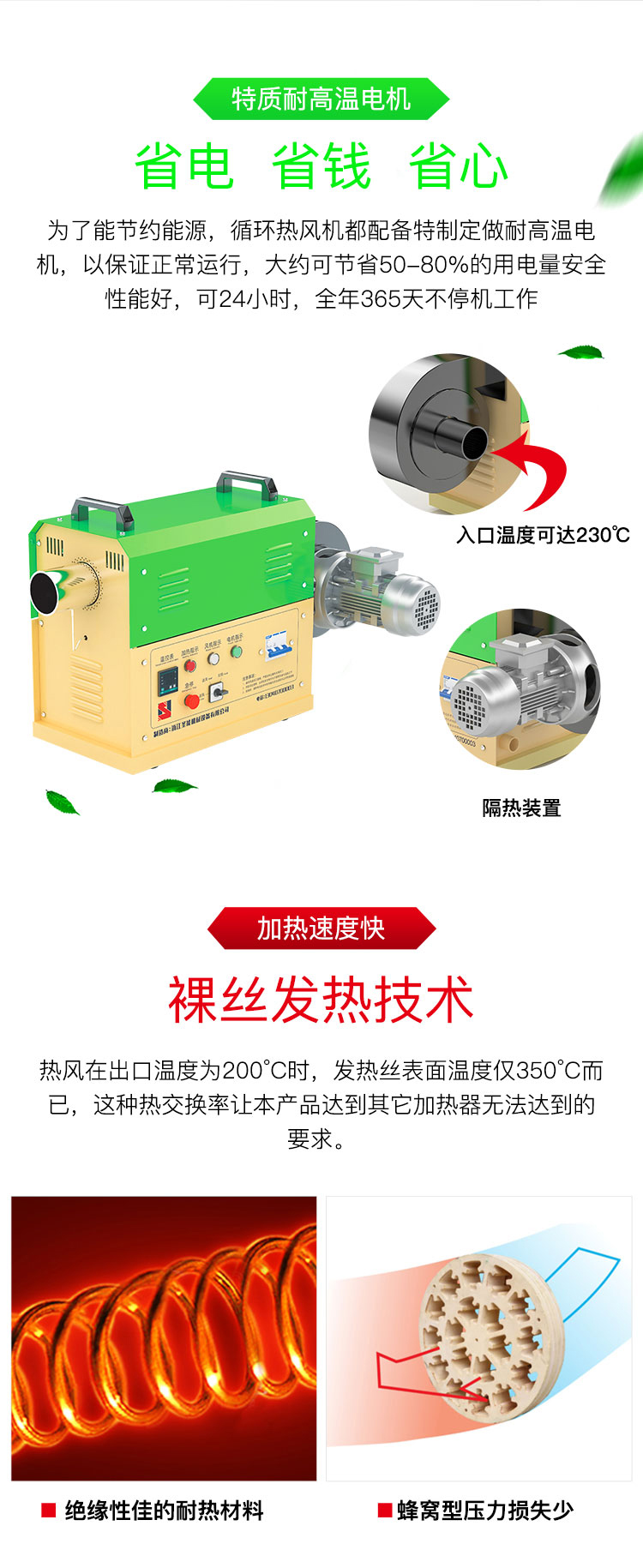 ④為了節(jié)約能源,循環(huán)型系列熱風(fēng)機(jī)都配備特制定做耐高溫電機(jī),以保證正常運(yùn)行,大約可節(jié)省50-80%的用電量。