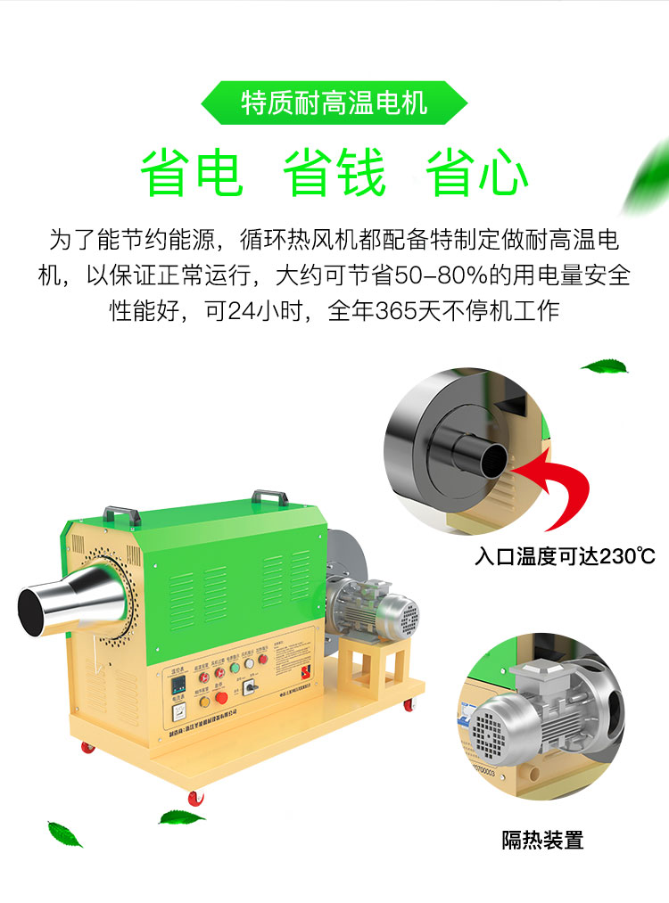 ④為了節約能源,循環型系列熱風機都配備特制定做耐高溫電機,以保證正常運行,大約可節省50-80%的用電量。