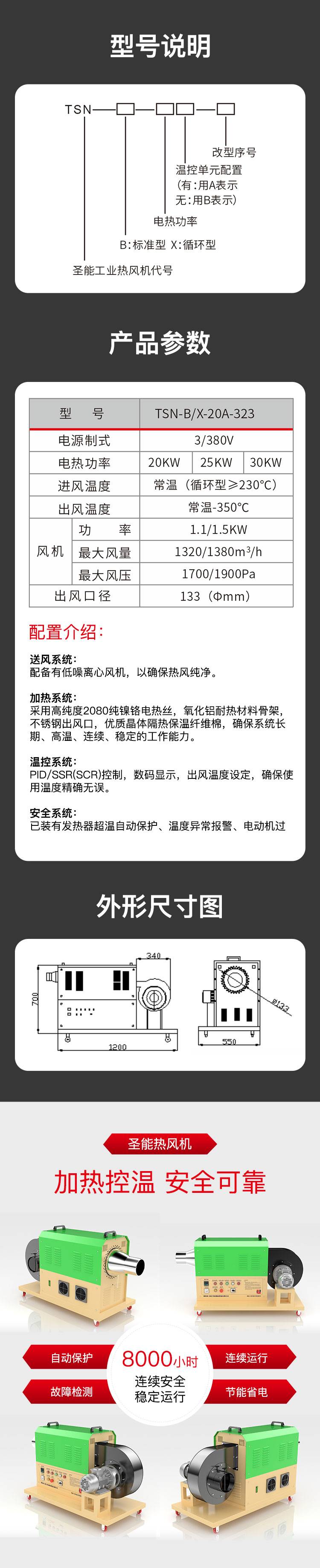 “TSN”工業熱風機主要由送風系統、加熱系統、溫控系統三大部分部分組成。通電后,鼓風機把空氣吹送到加熱器里,令空氣從螺旋狀的電熱絲內、外側均勻通過,電熱絲通電后產生的熱量與通過的冷空氣進行熱交換,從而使出風口的風溫升高。出風口處的K型熱電偶及時將探測到的出風溫度反饋到溫控儀,儀表根據設定的溫度檢測著工作的實際溫度,并將有關信息傳遞回固態繼電器進而控制加熱器是否工作。同時,鼓風機可利用風量調節器(變頻器、手動)調節吹送空氣的風量大小。另外,送風系統及加熱器,均有過載超溫自動保護裝置,總電路也設計了緊急摯,以保證安全,防止錯誤操作。